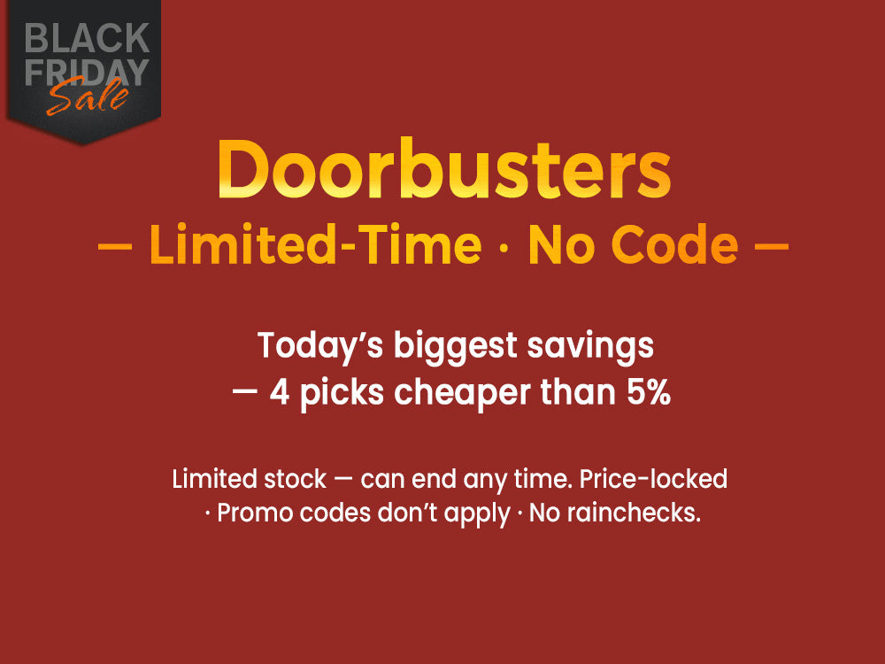 No code needed; no stacking. Promo codes (e.g., BFCM5) don’t apply to Doorbusters.